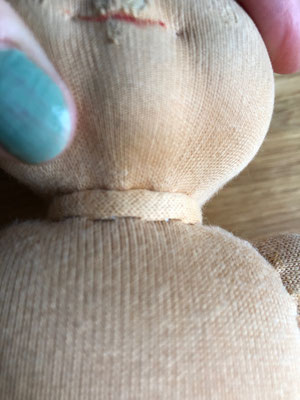 Puppi brauchte auch einen neuen Kopfbezug. Ihre Nase war schon, wie ich finde, sehr professionell repariert worden, so hätte ich es auch gemacht! Diese aufgenähte Nase sollte erhalten bleiben, auch nach dem neuen Bezug, und auch der Mund, der früher einmal dagewesen war (die Fadenreste habe ich im Kopf gefunden), sollte nicht wieder hergestellt werden. Der Kopf ließ sich vom Körper trennen und die Haare ließen sich abnehmen, so dass ich ohne Probleme den Kopf neu beziehen konnte. Die verdeckten Stellen und Nahtzugaben, dort wo kein Schmutz und Licht dran kam, verraten mir immer, welches die richtige Stofffarbe ist. Oft ist der Unterschied zu dem "Original" so groß, dass es schwer zu glauben ist, dass der Stoff wirklich einmal so aussah.