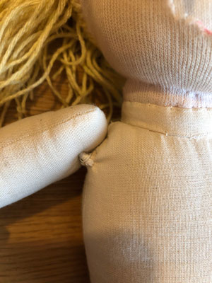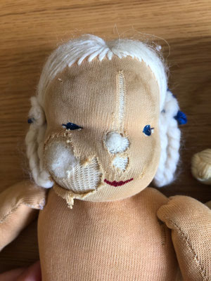 Bei Judith war der Körper so gut wie unversehrt, die wenigen Löcher habe ich mit einem Matratzenstich geschlossen, die rechte Hand habe ich neu abgebunden. Den Kopf habe ich neu bezogen, dafür mussten auch zuerst die eingestickten Haare entfernt werden. Ich habe Judiths Gesicht neu gestickt und sie hat neue Haare bekommen. Auf Wunsch bekommen die Puppen bei mir einen Bauchnabel.