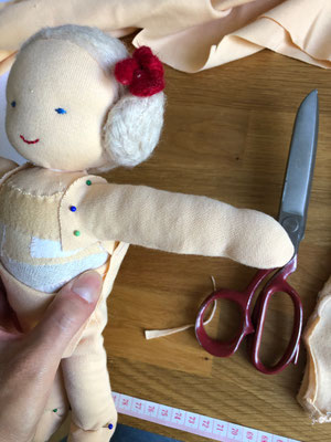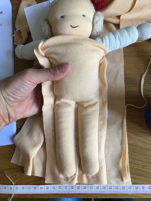 Ich mache Bilder der Puppe und messe sie aus, um sie möglichst detailgetreu wiederherzustellen. Sollen und müssen Teile der Puppe ausgetauscht werde, erstelle ich ein Schnittmuster. Das alles braucht Zeit.