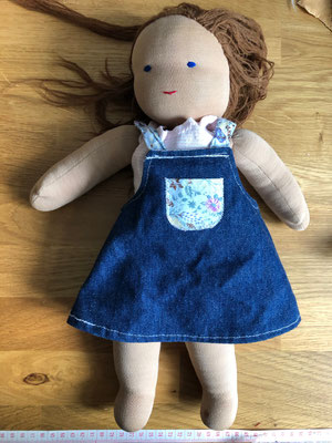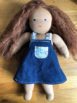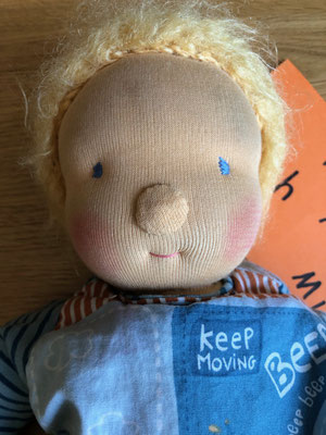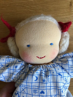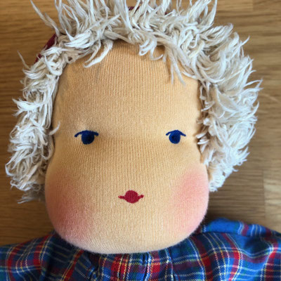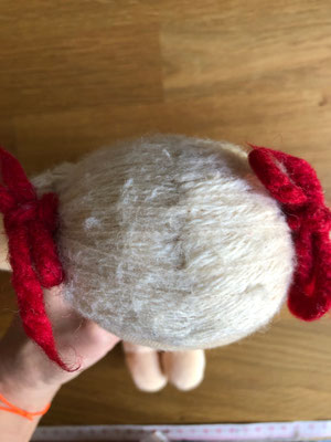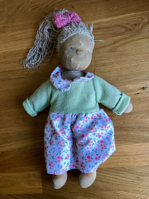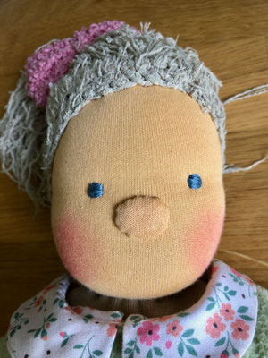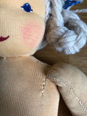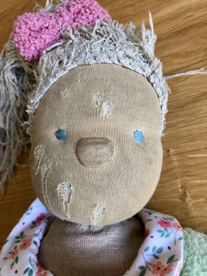 Bei Püppi habe ich den Kopf neu bezogen und das Gesicht neu gemalt. Die Puppenmama hat sich längere Haare gewünscht und so hat Püppi noch ein neues gehäkeltes Käppchen bekommen mit eingeknüpften Haaren.