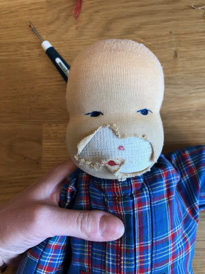 Joschi sollte einen neuen Kopfbezug bekommen, die Haare samt Mütze ließen sich zum Glück in zwei Schritten abnehmen. Wie im Original habe ich die Augenpositionen mit einem kleinen Stich Markiert und so den Stoffbezug am Kopf befestigt. Das Gesicht habe ich neu gemalt, auch möglichst originalgetreu.