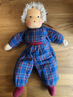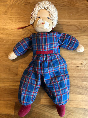 Bei Nanni habe ich den Kopf durch einen neuen ersetzt, das Gesicht neu bemalt und die Mütze geflickt sowie Löcher an den Händen und im Stoff gestopft.