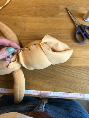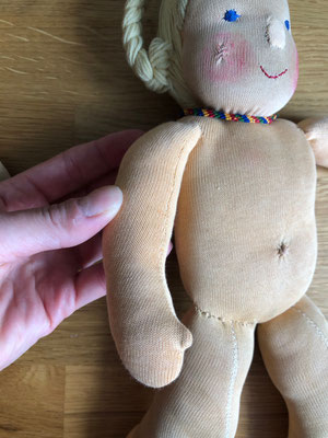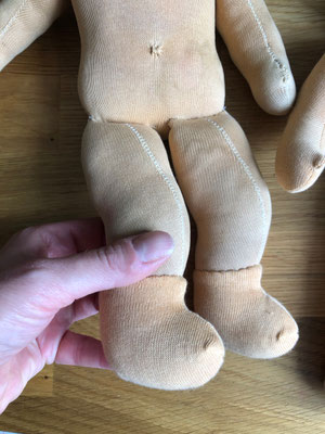 Bei Johanna war der Stoff von Armen und Beinen so spröde, dass er an mehreren Stellen aufgerissen ist. Auch am Körper zeigten sich erste Laufmaschen, das Gesicht war unversehrt. Ich habe für Arme und Beine einen neuen Bezug genäht, da es mit dem Stoff, den ich zur Verfügung hatte und der wesentlich dehnbarer ist, nicht möglich war, die gleiche Form und Festigkeit von Armen und Beinen hinzubekommen. Auch den Körper habe ich nach Absprache neu bezogen.