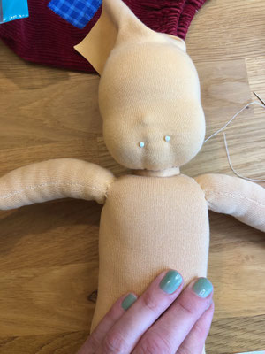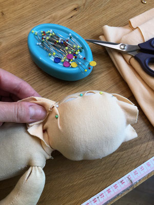 Ich habe Callas Kopf neu bezogen und die Positionen der aufgemalten Augen mit Stecknadeln markiert. Offene Stellen an den Nähten von Armen und Beinen habe ich repariert. So kann Calla zu Hause vollendet werden :).