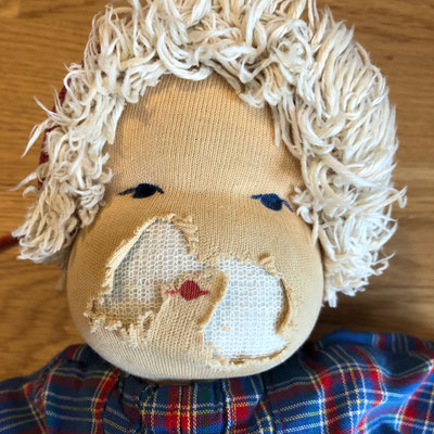 Bei Nanni habe ich den Kopf durch einen neuen ersetzt und das Gesicht neu bemalt. Vorher habe ich recherchiert, wie das Gesicht ursprünglich aussah. Die Mütze habe ich geflickt sowie Löcher an den Händen und im Stoff gestopft.