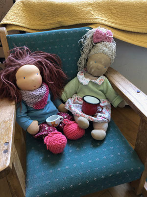 Ist die Puppe hier gut angekommen, mache ich ihr erstmal einen Tee oder Kakao, damit sie sich von der langen Reise erholen kann. Und damit sie sich nicht einsam fühlt, leisten ihr die Puppen meiner Töchter Gesellschaft. Das hat bisher immer gut geklappt. Falls die Puppe zu Hause sehr vermisst wird, schicke ich auch gerne Bilder.