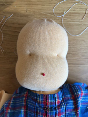 Amelie habe ich eine Nase aufgenäht, die offene Stelle in der Wange zugenäht und einen neuen Mund gestickt. Amelie hat auch neue Söckchen bekommen und neue Arme. Für beide wurde sich ein Bauchnabel gewünscht.