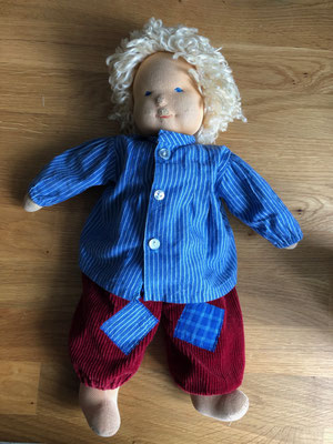 Toms gesamter Körper musste neu gemacht werden. Dafür habe ich einen Schnitt erstellt, den Körper neu genäht und die Augen neu gestickt. Haare und Kleidung habe ich ausgebessert und wiederverwendet. Die Hose hat einen Gummizug bekommen, damit man sie an- und ausziehen kann.