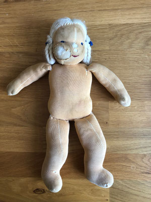 Bei Isabell habe ich den Kopf neu bezogen, das Gesicht neu gestickt und ich habe ihr neue lange Haare gemacht. Die ursprünglichen Haare waren in den Kopf gestickt und mussten erst vollständig entfernt werden. Außerdem hat Isabell einen Körper aus Webstoff, Arme und Beine waren mit Fadengelenken befestigt. Diese waren sehr locker oder kaputt und ich habe sie mit neuen Knopfgelenken ersetzt. Ich habe bei der Reparatur darauf verzichtet, den Kopf vom Körper zu trennen. Die Ansatznaht des neuen Kopfbezuges habe ich unter der "Halskrause" aus Webstoff versteckt. Unter dem Kinn war der Stoff punktuell am Kopf befestigt, das habe ich wieder so nachempfunden.