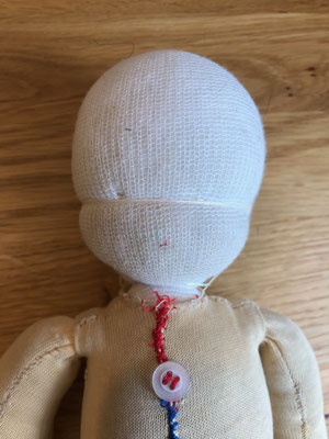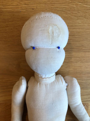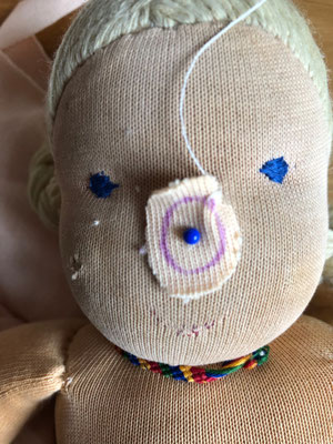 Bei diesem kleinen Püppchen waren das Gesicht und die Hände mit Klebstoff überzogen. Beim Entfernen des Stoffes hat es Löcher in den darunterliegenden Mullschlauch gerissen. Die habe ich gesichert, einen neuen darübergezogen und die Augenlinie neu abgebunden. Am Hinterkopf konnte ich die ursprüngliche Augenfarbe erkennen, die wesentlich heller war als ich angenommen hatte. Der Klebstoff hatte die Farbe verdunkelt. Ich habe das Gesicht neu gestickt und die Hände ausgetauscht.
