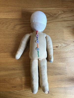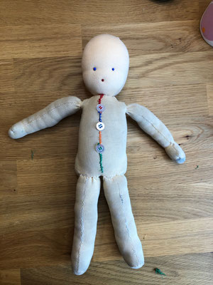 Ich habe den Kopf frisch bezogen, das Gesicht neu aufgemalt und die Perücke wieder festgenäht. Hände und Füße waren locker und wurden neu angenäht, sowie das Oberteil an den Körper.
