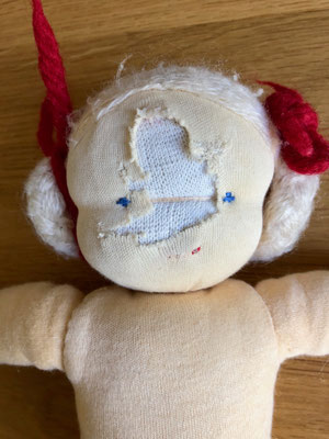 Lottas Kopf habe ich neu bezogen und das Gesicht neu aufgemalt. Die Haare und die Hände habe ich ersetzt. Da ich keinen vergleichbaren Stoff für das Kopftuch finden konnte, habe ich mich nach Absprache dazu entschieden, es auszubessern: Ich habe einen Stoff zur Stabilisierung auf die Rückseite gebügelt und die Löcher geflickt. Auch die Löcher im Körperstoff habe ich mit der "Visible Mending"- Methode ausgebessert.
