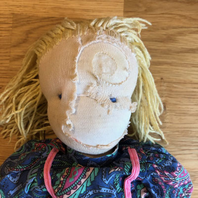 Ninas Kopf habe ich ebenfalls neu bezogen und vorher die Schäden am Mullschlauch ausgebessert. Das Gesicht habe ich aufgemalt und eine neue Perücke gehäkelt.